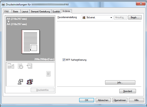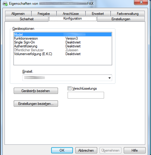 Öffnen Sie die Registerkarte [Konfiguration] des Faxtreibers und stellen Sie sicher, dass die Benutzerauthentifizierung oder die Volumenverfolgung korrekt eingerichtet wurde.