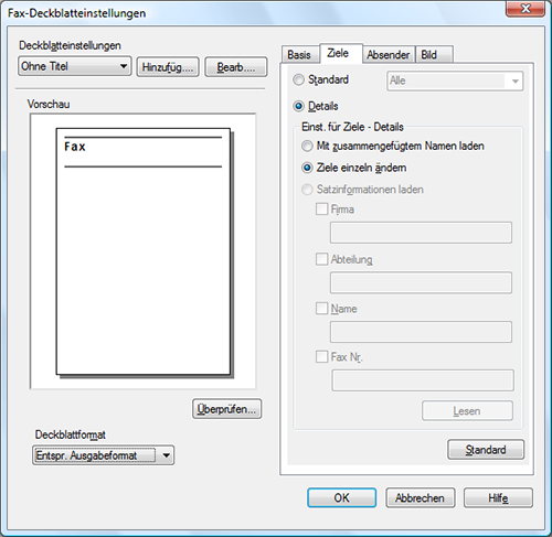 [Ziele einzeln ändern] | Mit dieser Option werden die Informationen geändert, die für jeden Empfänger auf das Deckblatt gedruckt werden. Geben Sie den Inhalt im Bildschirm [Faxübertragungs-Popup] in der [Empfängerliste] ein. Sie können unterschiedliche Deckblätter für bis zu 100 Empfänger erstellen. | |