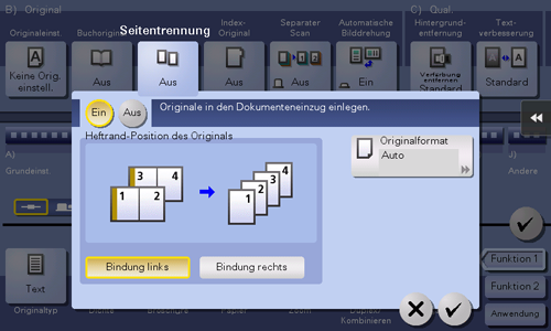 [Heftrand-Position des Originals] | Wählen Sie [Bindung links] oder [Bindung rechts] als Bindeposition für Doppelseiten aus. |