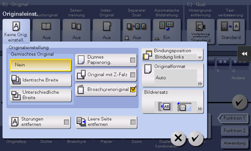 [Originalformat] | Wenn das Format des Originals nicht ordnungsgemäß erkannt wird, geben Sie das Format des Originals, das Sie verwenden möchten, manuell an. Wenn das System das Format von Originalen oder Fotos, die eine irreguläre Größe aufweisen, nicht erkennen kann, geben Sie das Format manuell ein. |