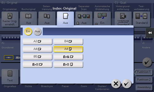 [EIN]/[AUS] | Wählen Sie [EIN], um das Index-Original zu verwenden. Wählen Sie auch das Format des Index-Originals aus. |