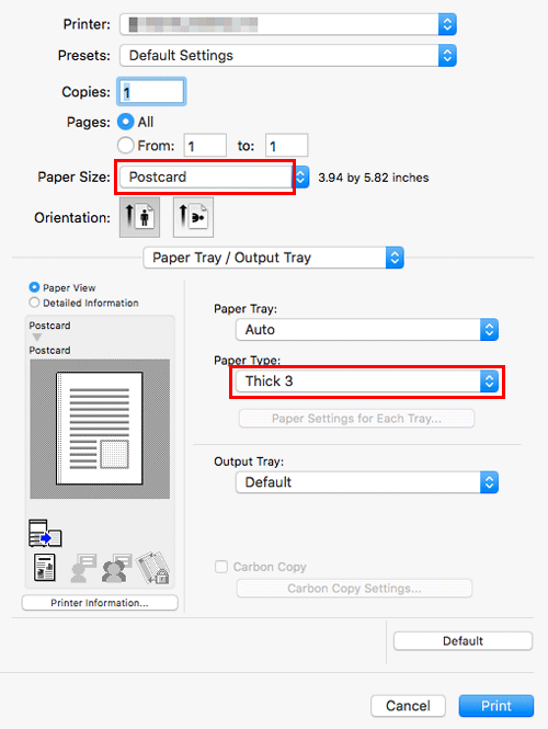 If Postcard is selected, [Paper Type:] is automatically set to [Thick 3]. If [Envelope] is selected, [Paper Type:] is automatically set to [Envelope].