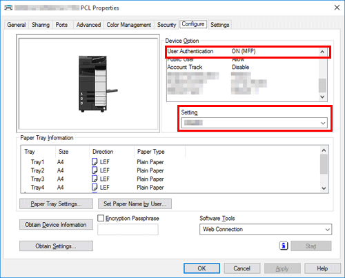 From [Device Option] in the [Configure] tab, select [User Authentication], then select the authentication status from [Setting].