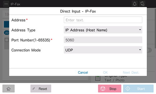 Per i dettagli, consultare le impostazioni di [Immissione diretta - Fax IP] (descritte dopo questa procedura).