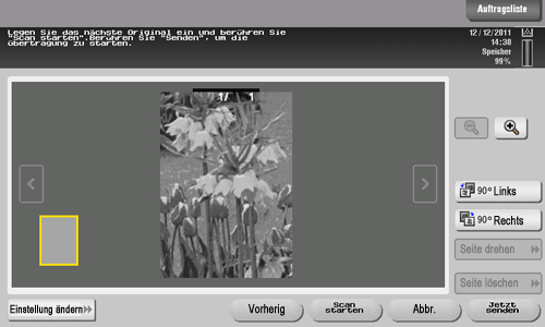 Wenn das aus mehreren Seiten bestehende Original gescannt wurde, tippen Sie auf die Seitensendetaste rechts und links, so dass Sie die Seite senden oder zurückkehren können.