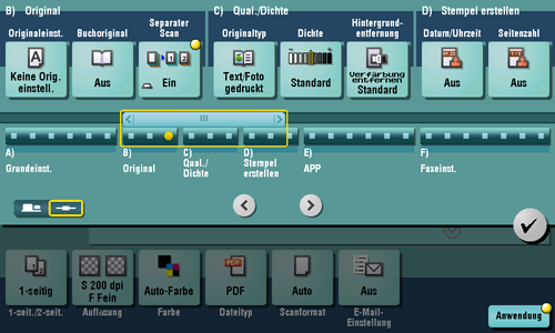 Tippen Sie auf [Anwendung] - [Original] - [Separater Scan] und wählen Sie die Einstellung [EIN] aus.