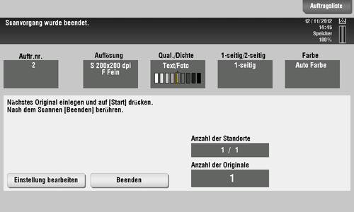 Nachdem alle Originale gescannt wurden, tippen Sie auf [Beenden] und drücken die Taste Start.