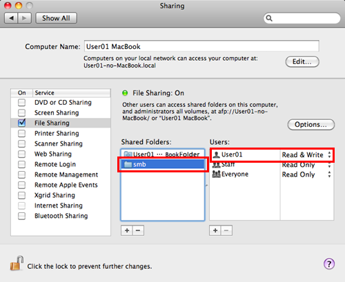 Klicken Sie auf [Options] und wählen Sie [Share files and folders using SMB (Windows)] aus. Aktivieren Sie dann das Kontrollkästchen für den Anmeldebenutzernamen (angezeigter Name).