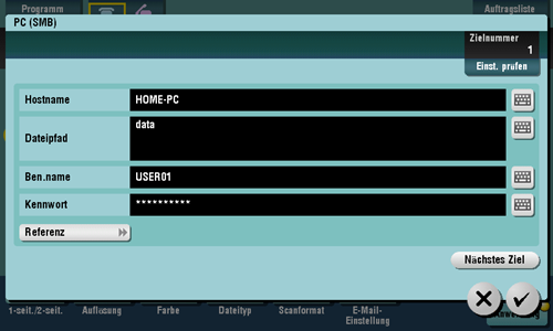 Geben Sie den Hostnamen und Dateipfad des Ziels manuell ein, oder tippen Sie auf [Referenz] und geben Sie den freigegebenen Ordner des Ziels an. Tippen Sie dann auf [OK].