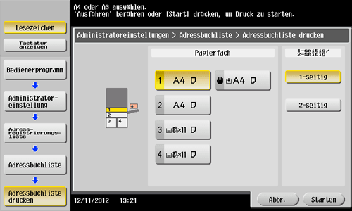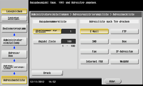 Tippen Sie auf [Bedienerprogramm] - [Administratoreinstellungen] - [Adresse/ Box] - [Adressregistrierungsliste] - [Adressbuchliste].