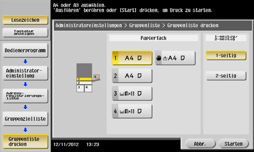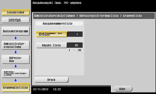 Tippen Sie auf [Bedienerprogramm] - [Administratoreinstellungen] - [Adresse/ Box] - [Adressregistrierungsliste] - [Gruppenzielliste].
