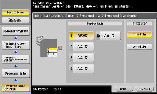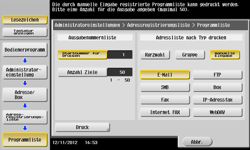 Tippen Sie auf [Bedienerprogramm] - [Administratoreinstellungen] - [Adresse/ Box] - [Adressregistrierungsliste] - [Programmliste].