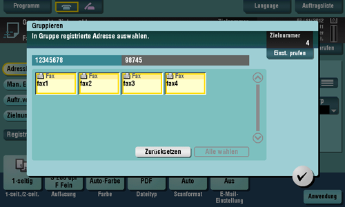 Wenn unter [Adressbuch] ein Gruppenziel ausgewählt wird, wählen Sie die Ziele, denen Sie Daten senden wollen, unter den innerhalb der Gruppe registrierten Zielen aus. Wenn Sie eines der in der Gruppe registrierten Ziele vom Datenempfang ausschließen möchten, tippen Sie auf [Alle wählen] und anschließend auf das Ziel, dessen Auswahl aufgehoben werden soll.