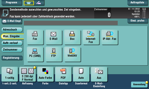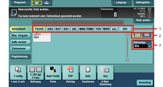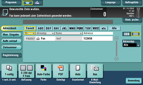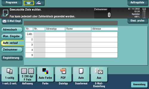 Im Verlauf werden die letzten fünf Faxziele angezeigt. Bei Bedarf können mehrere Ziele aus dem Verlauf ausgewählt werden.