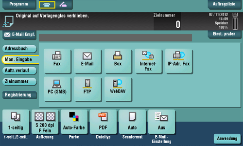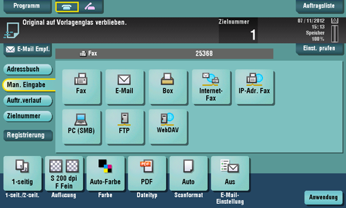 Tippen Sie auf [Man. Eingabe], wählen Sie [Fax] und geben Sie dann eine Faxnummer ein.