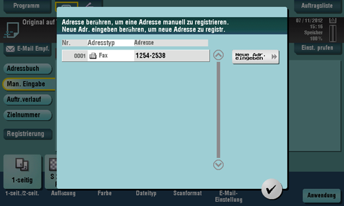 Wenn ein Fax an die manuell eingegebene Faxnummer gesendet wurde, tippen Sie auf [Adressbuch] und prüfen Sie, ob die Faxnummer registriert ist.