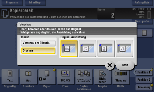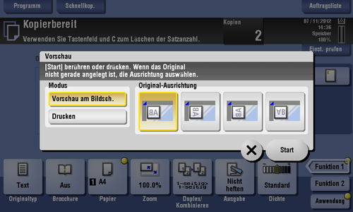 Sie können das Ausgabebild einer Kopie vor dem Kopieren auf dem Touch Display überprüfen.