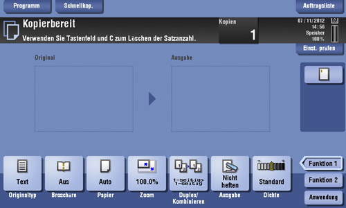 Ein registriertes Kopierprogramm, also eine Kombination aus verschiedenen Kopiereinstellungen, kann mit einer einfachen Aktion vom Hauptbildschirm aus abgerufen werden.