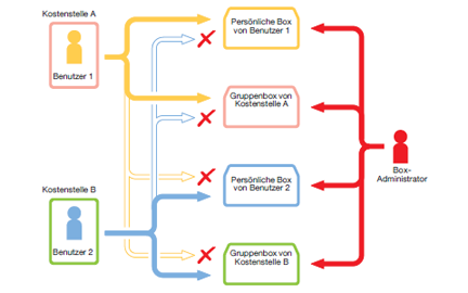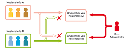 Wenn die Kostenstellenverwaltung implementiert wurde, kann ein Benutzer nur auf die Gruppenbox der Abteilung zugreifen, der er angehört. Ein Benutzer einer anderen Abteilung hat keinen Zugriff auf diese Box.