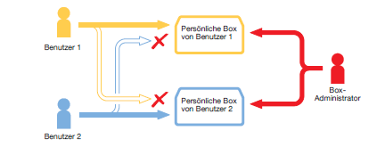 Wenn sowohl die Benutzerauthentifizierung als auch die Kostenstellenverwaltung implementiert sind, kann ein Benutzer auf die öffentliche Box, auf eine selbst erstellte Benutzerbox oder auf die Gruppenbox der Abteilung zugreifen, der er angehört.