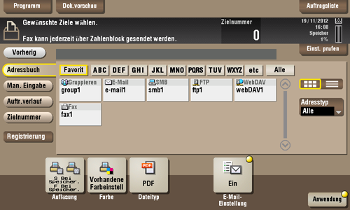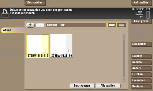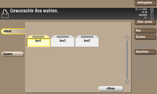 In diesem Beispiel wird für Erklärungszwecke die öffentliche Box verwendet. Zur Verwendung einer persönlichen Box oder einer Gruppenbox tippen Sie auf [Privat] oder [Gruppieren] und wählen die gewünschte Box aus.