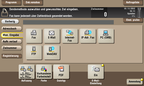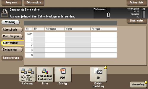 Tippen Sie auf [Auftr.verlauf], um ein Ziel aus dem Scan- oder Faxverlauf auszuwählen.
