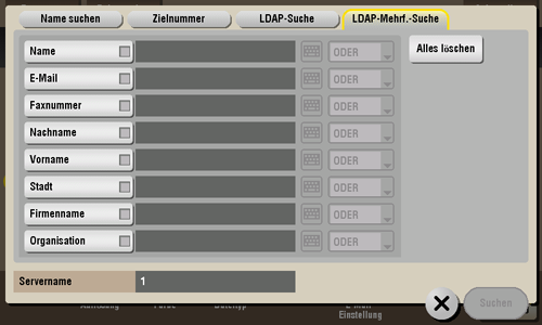 Es gibt zwei Suchmöglichkeiten: [LDAP-Suche], bei der eine E-Mail-Adresse oder Faxnummer anhand eines einzigen Schlüsselworts gesucht wird, und [LDAP-Mehrf.-Suche], bei der eine E-Mail-Adresse oder Faxnummer anhand einer Kombination von Schlüsselwörtern unterschiedlicher Kategorien gesucht wird.