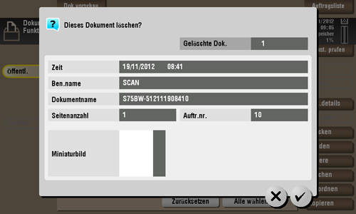 Wählen Sie eine Datei und tippen Sie dann auf [Löschen]. Die Datei wird gelöscht. Sie können mehrere Dateien auswählen und gleichzeitig löschen. Überprüfen Sie die Dateidetails und tippen Sie dann auf [OK].
