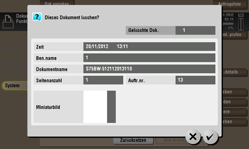 Wählen Sie eine Datei und tippen Sie dann auf [Löschen]. Die Datei wird gelöscht. Sie können mehrere Dateien auswählen und gleichzeitig löschen. Überprüfen Sie die Dateidetails und tippen Sie dann auf [OK].