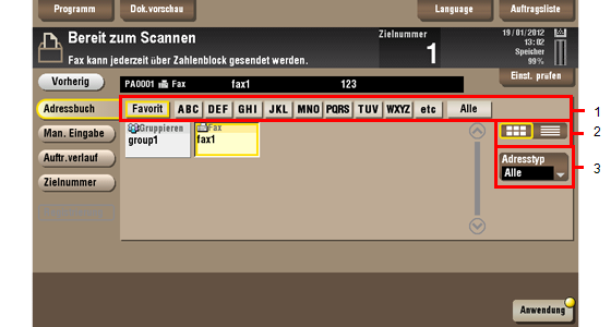 Tippen Sie auf [Auftr.verlauf], um ein Ziel aus dem Scan- oder Faxverlauf auszuwählen.