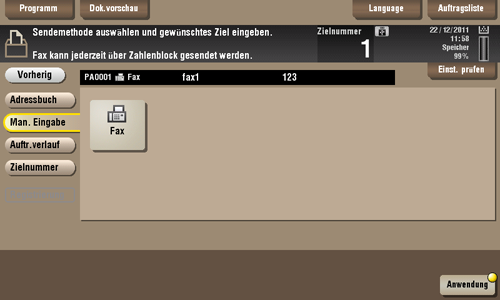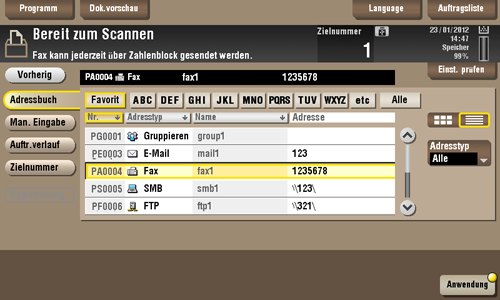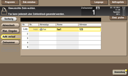 Im Verlauf werden die letzten fünf Faxziele angezeigt. Bei Bedarf können mehrere Ziele aus dem Verlauf ausgewählt werden.