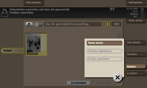 Wählen Sie eine Datei und tippen Sie dann auf [Andere] - [Name bearb.]. Jetzt können Sie die Datei umbenennen. Geben Sie über das Touch Display einen neuen Namen ein.
