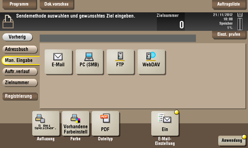 Das Rundsenden ist möglich, wenn mehrere Ziele ausgewählt werden. Das Rundsenden kann auch für andere Dateitransferfunktionen verwendet werden, wie z. B. für die parallele E-Mail- und SMB-Dateiübertragung.