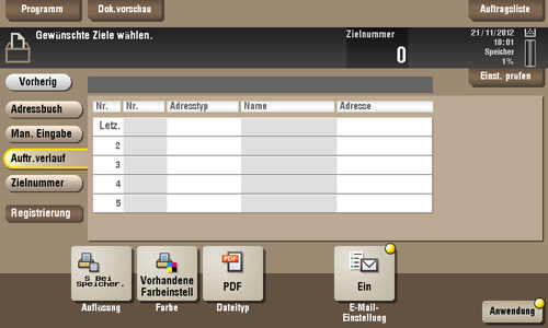 Tippen Sie auf [Auftr.verlauf], um ein Ziel aus dem Scan- oder Auftragsverlauf auszuwählen.