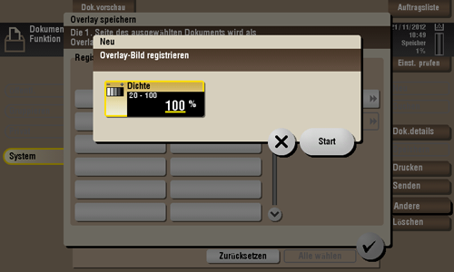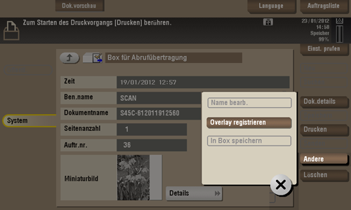 Nach der Registrierung können Sie während des Kopierens oder Druckens über einen PC ein Overlay-Bild auf dem Original erstellen. Sie können auch während des Dateidrucks ein Overlay-Bild auf einer Boxdatei erstellen.
