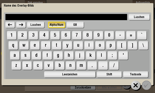 Nach der Registrierung können Sie ein Overlay-Bild auf dem Original erstellen und es im Kopiermodus durch die Auswahl von [Anwendung] und [Overlay-Bild registrieren] kopieren. Auch wenn Sie eine Datei aus einer Box drucken, können Sie ein Overlay-Bild auf der Datei erstellen und durch Auswahl von [Anwendung] - [Overlay-Bild registrieren] drucken.