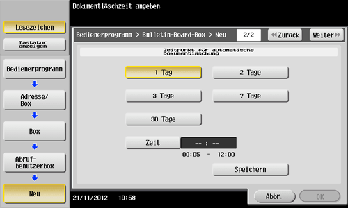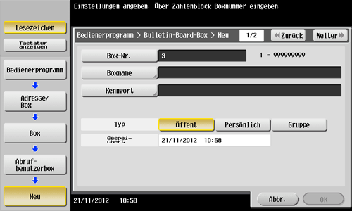 Tippen Sie auf [Bedienerprogramm] - [Adresse/Box] - [Box] - [Abrufbenutzerbox] - [Neu].