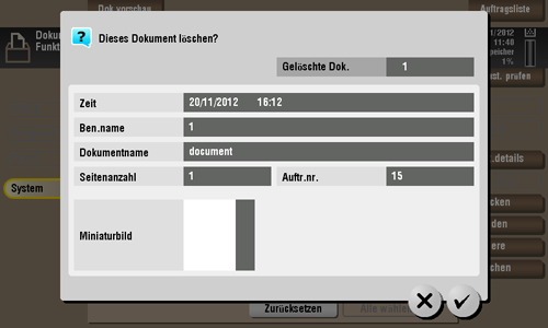 Wählen Sie eine Datei und tippen Sie dann auf [Löschen]. Die Datei wird gelöscht. Sie können mehrere Dateien auswählen und gleichzeitig löschen. Überprüfen Sie die Dateidetails und tippen Sie dann auf [OK].
