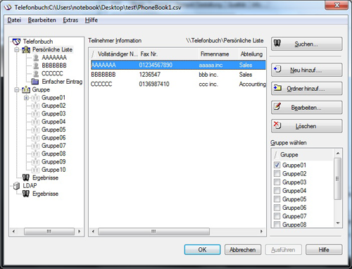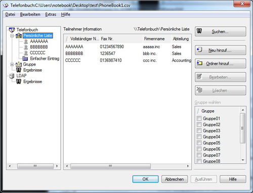 Die Teilnehmerinformationen werden registriert und unter [\\Telefonbuch\Persönliche Liste] angezeigt. Wenn Sie Gruppen für den Empfänger ausgewählt haben, wird dies in der Gruppenliste angezeigt.
