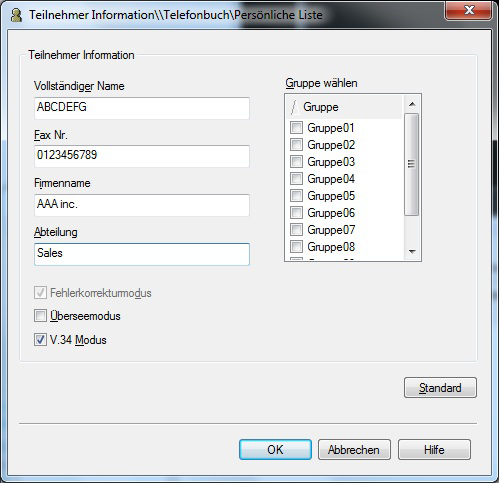[Gruppe wählen] | Wenn Sie einen Empfänger zu einer Gruppe hinzufügen wollen, aktivieren Sie das entsprechende Gruppenkontrollkästchen. Sie können einen Empfänger auch zu mehreren Gruppen hinzufügen. Sobald Sie Empfänger hinzugefügt haben, können Sie diese durch Auswahl der entsprechenden Gruppe (für Rundsendeübertragung) angeben. Wenn Sie häufig Faxe an bestimmte Empfänger senden werden, sollten Sie diese Empfänger zu einer Gruppe hinzufügen. |