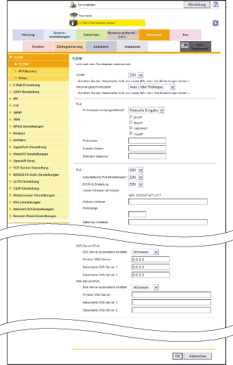Wählen Sie im Administratormodus [Netzwerk] - [TCP/IP] - [TCP/IP] aus und konfigurieren Sie dann die folgenden Einstellungen.