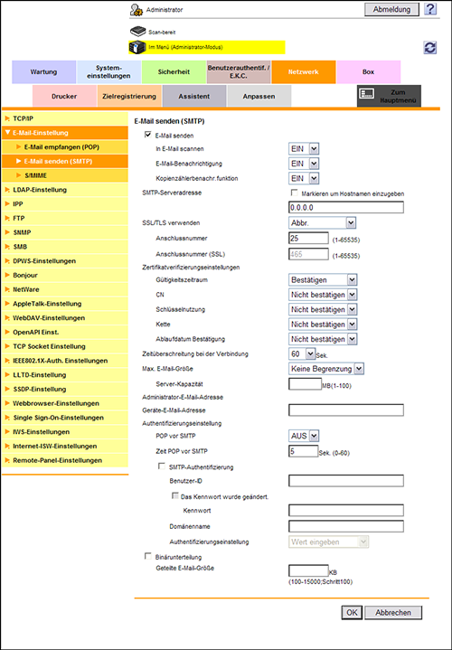 Wählen Sie im Administratormodus [Netzwerk] - [E-Mail-Einstellung] - [E-Mail senden (SMTP)] und richten Sie die folgenden Einstellungen ein.