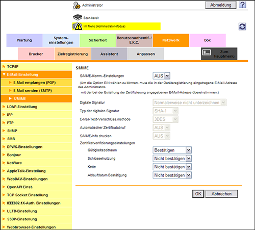 [S/MIME-Komm.-Einstellungen] | Wählen Sie [EIN] aus, um S/MIME zu verwenden. Zur Auswahl von [EIN] muss die E-Mail-Adresse des Zertifikats für dieses System der E-Mail-Adresse des Administrators entsprechen. [AUS] ist standardmäßig ausgewählt. |