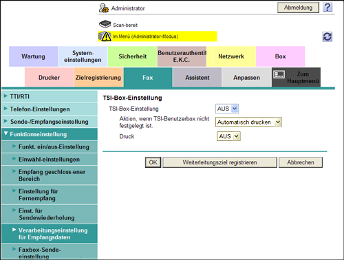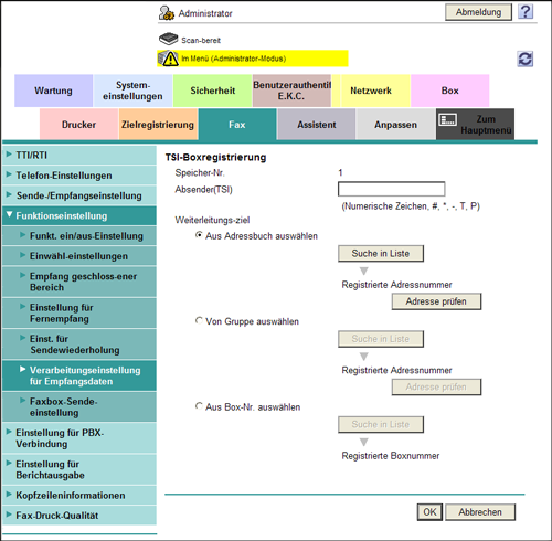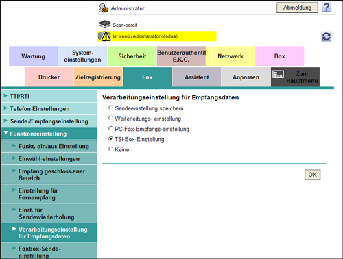 Wählen Sie im Administratormodus [Fax] - [Funktionseinstellung] - [Verarbeitungseinstellung für Empfangsdaten] - [TSI-Box-Einstellung] und klicken Sie dann auf [OK].
