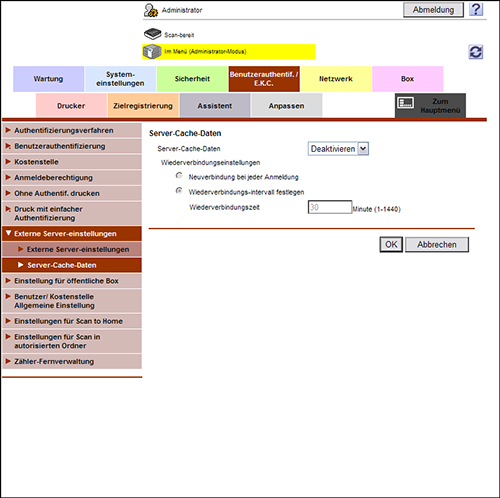 [Server-Cache-Daten] | Um Authentifizierungsinformationen temporär im Hauptsystem zu speichern, für den Fall, dass ein externer Authentifizierungsserver inaktiv wird, wählen Sie [Aktivieren] aus. [Deaktivieren] ist standardmäßig ausgewählt. |