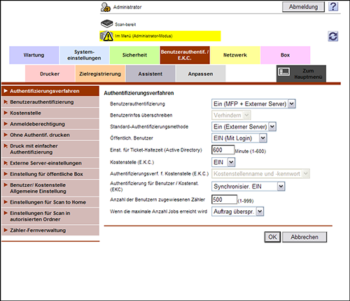 [Benutzerauthentifizierung] | Bei der Authentifizierung über einen externen Authentifizierungsserver wählen Sie [EIN (Externer Server)] oder [EIN (MFP + Externer Server)] aus. Wenn Sie Einstellungen einrichten möchten, um bei Problemen auf dem externen Authentifizierungsserver die Anmeldung an diesem System anhand der systemeigenen Authentifizierungsfunktion zu ermöglichen, wählen Sie [EIN (MFP + Externer Server)]. |