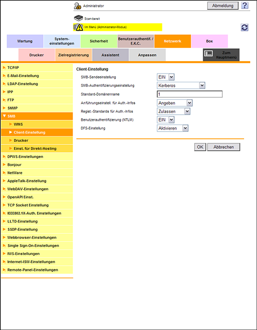 Wählen Sie im Administratormodus [Netzwerk] - [SMB] - [Client-Einstellung] aus und konfigurieren Sie dann die folgenden Einstellungen.