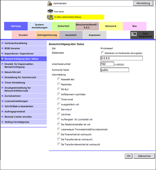 Wenn Sie die Systemstatusbenachrichtigung mit der SNMP TRAP-Funktion verwenden möchten, wählen Sie im Administratormodus [Wartung] - [Benachrichtigung über Status] - [IP-Adresse] oder [IPX Adresse] - [Bearbeiten] und richten Sie dann die folgenden Einstellungen ein.