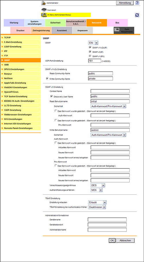 Aktivieren Sie SNMP. Geben Sie außerdem an, ob die Authentifizierungseinstellung oder die TRAP-Funktion von SNMP verwendet werden soll.