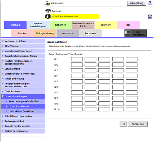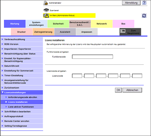 Wählen Sie im Administratormodus [Wartung] - [Lizenzeinstellungen] - [Lizenz installieren] und geben Sie die Funktions- und Lizenzcodes ein. Klicken Sie dann auf [OK].